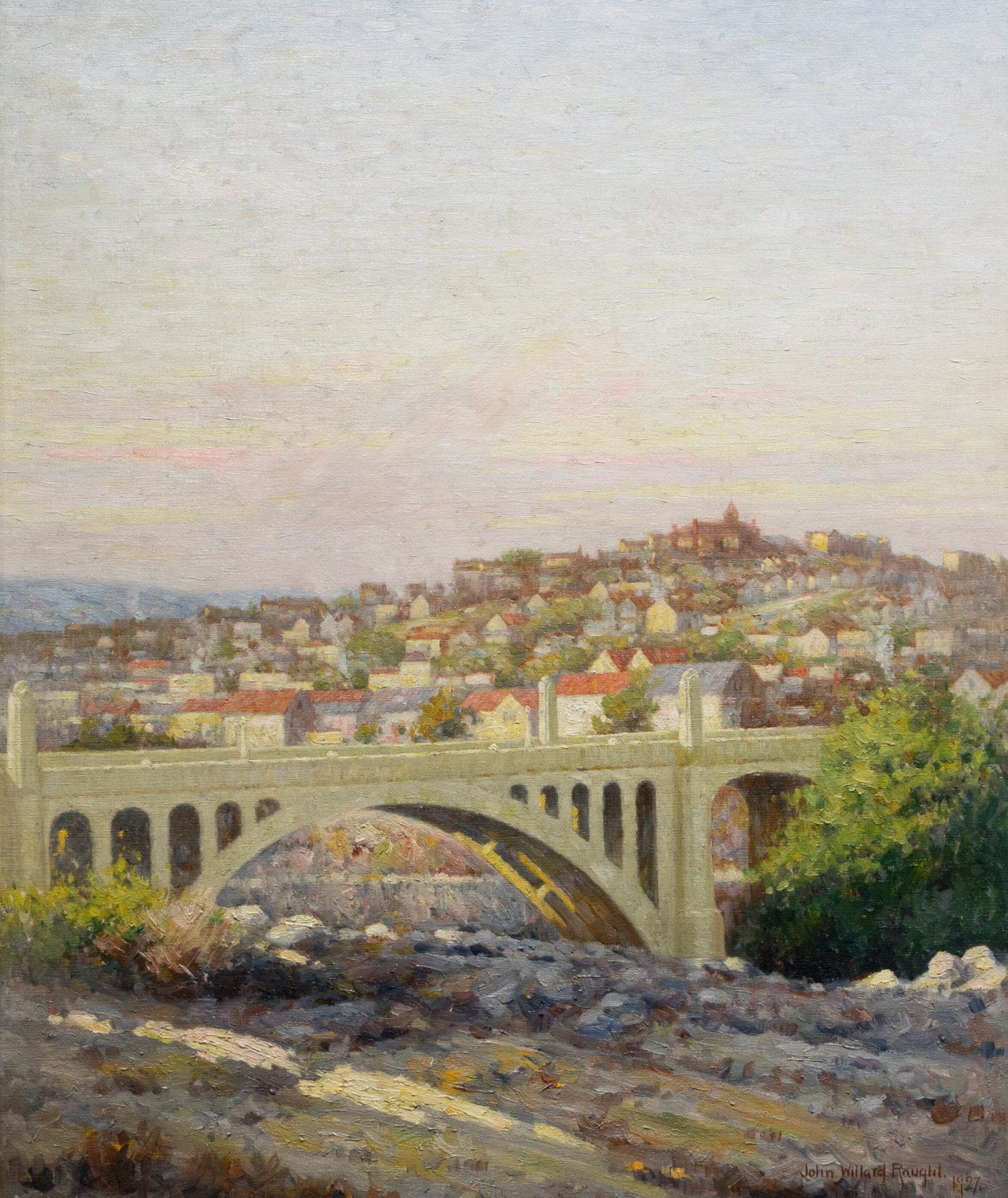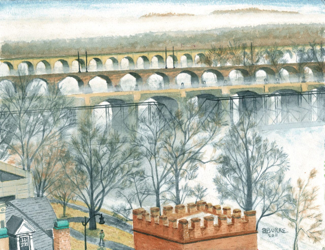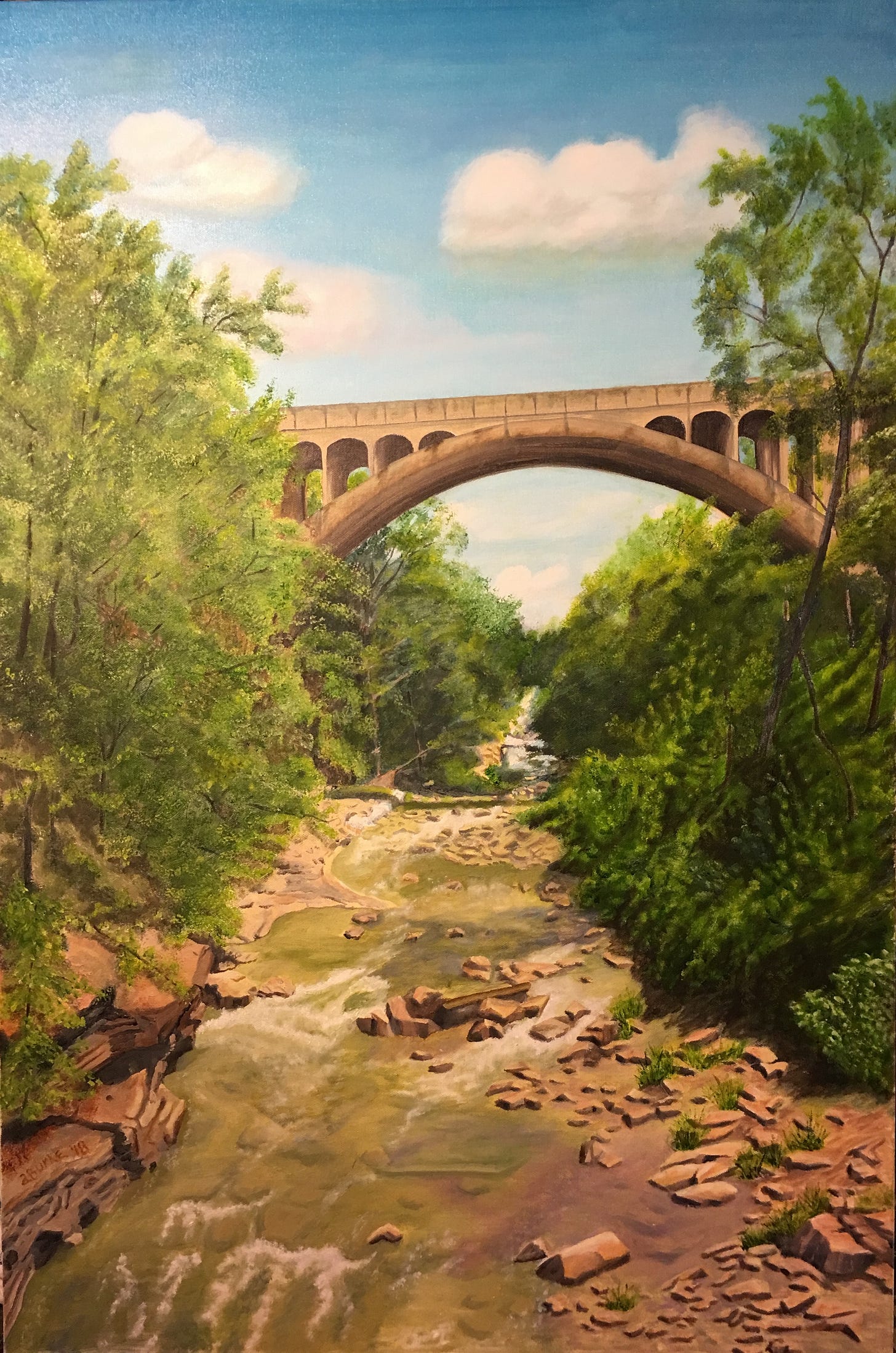 Austin Burke has also entered into dialogue with painter John Willard Raught, Scranton’s impressionist. In his 1927 painting of Harrison Avenue Bridge, seen from above, Raught creates a glowing, panoramic view of Scranton. Burke chose to paint the bridge from below, looking up at it from the riverbed. In this painting, he celebrates both nature and community efforts to restore and preserve Scranton’s environment.